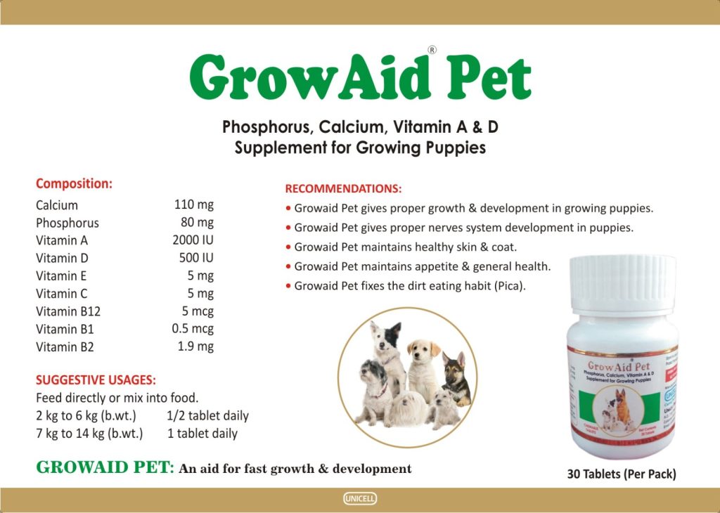 Grow Aid Pet is an Aid for fast growth and development in growing Dog and Cats..with Phosphorus, Calcium Vitamin A & D Supplements..